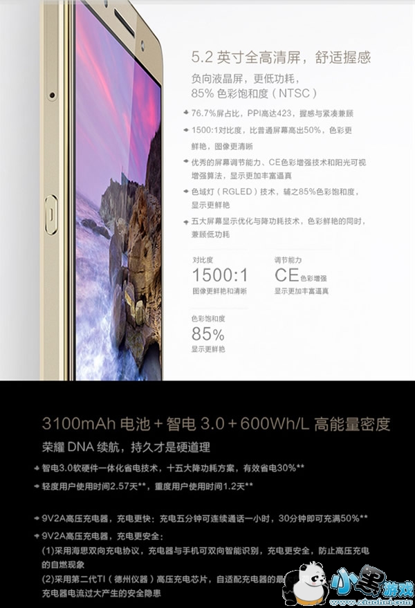 荣耀7采用5.2寸1080屏幕,2.3GHz八核64位麒麟935处理器,3GB LPDDR3内存,存储空间16GB起,支持最大128GB扩展卡,提供800万前置(配备自拍柔光灯)+2000万像素后置摄像头,内置3100mAh电池(9V2A高压充电器,充电5分钟可连续通话1小时),支持4G双卡双待,运行EMUI 3.1系统。
