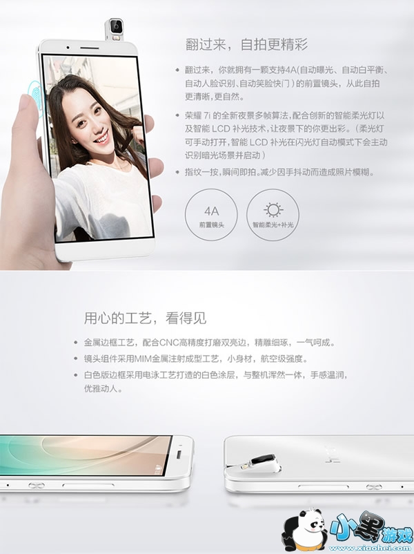 荣耀7i配备5.2寸1080屏幕,内置高通骁龙616八核64位处理器,存储方面采用2GB/3GB 内存+32GB/64GB机身存储,摄像头方面使用了一枚1300万像素索尼背照式可翻转镜头,f/2.0光圈与28mm广角保证拍摄照片的品质,官方称这枚可翻转镜头可翻转超过100000次。