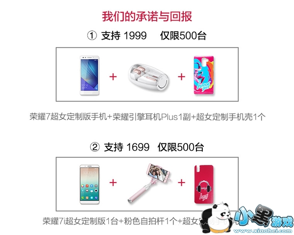 荣耀7超女定制礼盒:包含荣耀7全网通版(颜色:玫瑰金)+超女定制手机壳+荣耀引擎耳机Plus粉色版,1999元。
