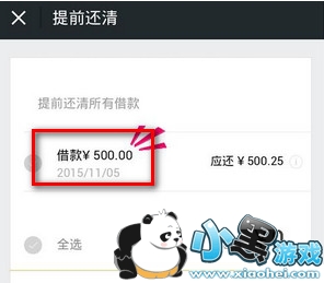 5.如果你有多条借款记录未还清,可以点击[全选]选择全部款项进行还款,也可以选择其中一条进行提前还款