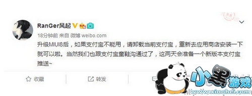 在升级了MIUI8之后,不少用户发现自己的支付宝突然不能用了,纷纷吐槽MIUI8居然连支付宝都无法支持。好消息是,MIUI官方工作人员已经发现了这个问题,并给出了解决方案。IUI运营经理@RanGer风起刚刚在微博上表示,如果升级了MIUI8导致支付宝无法使用,只需删除后在应用商店重新下载安装就能正常使用。