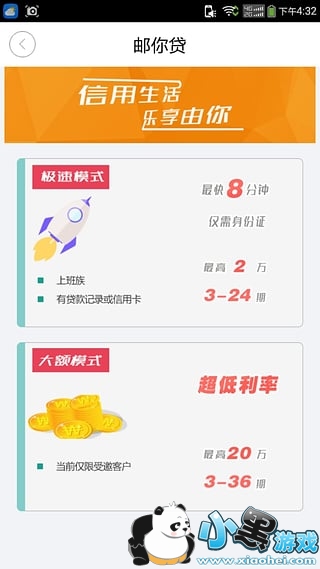 在邮你贷界面,有着二胎贷,极速模式,大额模式三种贷款模式,你可以选择适合自己的贷款模式;