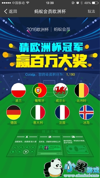 打开支付宝,在蚂蚁会员欧洲杯活动页面选择你支持的国家,创建或加入群组,用蚂蚁会员积分押注。如果你支持的球队夺冠,就有机会瓜分百万现金哦!