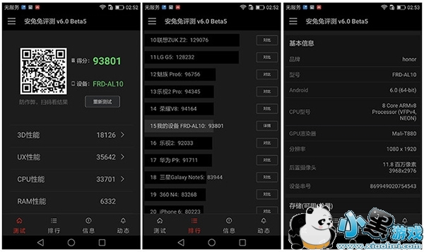 从国内常用的安兔兔跑分测试来看,荣耀8(高配版)获得了93801的成绩。从安兔兔官方给出的排名来说,其性能处于主流手机的中游位置。虽然相比搭载骁龙820处理器的手机仍有一段距离,但相比联发科Helio X20/X25处理器来说基本相当。