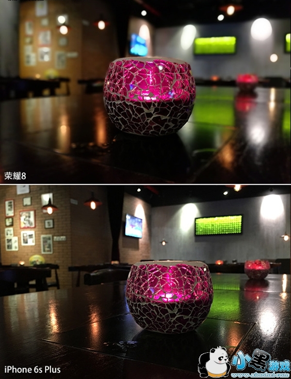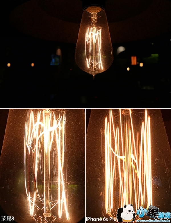 既然少了光学防抖,那么我们就有必要真刀真枪的实际测试一下。由于与同门荣耀V8对比并没有太大意义,毕竟同样的硬件也没有太多差距,那么干脆与智能手机拍照标杆iPhone6进行对比。首先,我们在弱光拍摄的情况下,在没有光学防抖的情况下照片并没有出现拍虚的现象。其次,我们通过两款手机100%细节对比我们也可以发现荣耀8要更清楚一些,灯丝一根是一根,而iPhone 6S Plus则会出现轻微的涂抹现象。