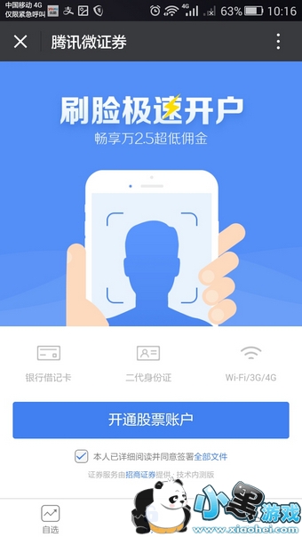 “微证券”支持人脸识别开户,识别技术由腾讯开发,可7x24小时接入公安部查询服务中心的数据库,为用户进行远程开户。
