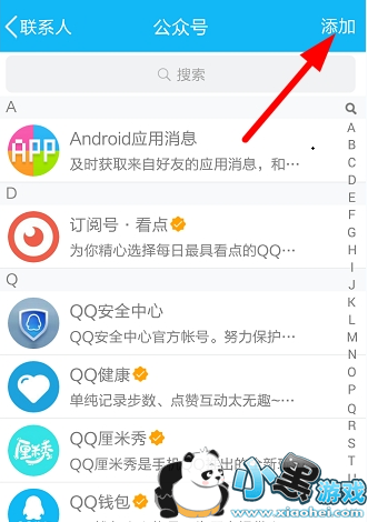 1、进入手机qq之后,选择“公众号”,进入公众号页面之后,点击右上角的“添加”;
