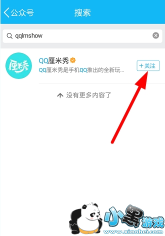 2、搜索中输入“qqlmshow”,然后点击搜索,下方便会出现QQ厘米秀的公众号,然后点击“关注”进入公众号页面