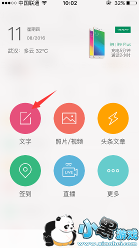 打开新浪微博后,点击下面中间的那个“+”按钮: