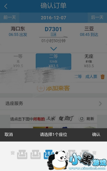 优化后的12306的核对信息对话框出现了新的功能,“选座喽!”的黄色字体提示旅客可以选座位了。根据提示,旅客可以选“ABCDF”五个位置,其中A、F靠窗,C、D靠过道。不过系统提示,选座后如果系统票额不足,系统将随机为您申请席位。又试了海口到三亚的Z201次普速列车和北京到石家庄、上海的高铁列车,发现都没有开通选座功能,确认订单前都提示“系统将随机为您申请席位,暂不支持自选座席”。
