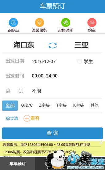 “正晚点”查询可以查询过去1小时和未来3小时内列车正晚点信息;“温馨服务”的服务类型包括重点旅客预约、遗失物品查找、质量服务投诉、网络购票投诉、建议及客服电话查询;“起售时间”可以查询各地火车站的售票时间。同时,12306客户端开放接口首个出行服务合作伙伴也已上线。用户使用12306客户端购买火车票时,可直接预约首汽约车的车辆,“铁路+网约车”可一站式出行。