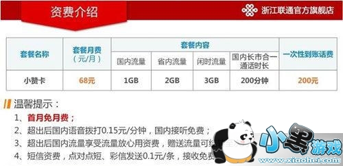 京东小赞卡套餐费每月68元,6GB流量包括1GB国内流量、2GB省内流量、3GB闲时流量,国内长市合一通话时长为200分钟,首月免月租费。目前该套餐是由浙江联通率先推出,至于中国联通其他地区是否会推出该套餐目前还不得而知。