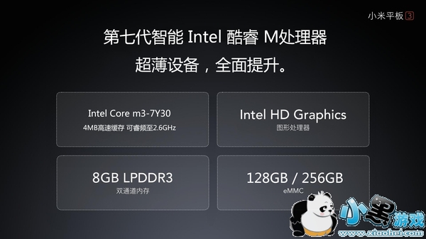 今天在GizmoChina上突然出现了一组疑似小米平板3的官方PPT截图。有意思的是这次曝光的截图不论是从设计还是文案都和小米一直以来的风格极为相似,所以总的来说这次的曝光可信度还是极其高的哟。小米平板3拥有一块9.7英寸的2048×1536触摸屏幕,机身厚度为6.08mm。机身内置英特尔酷睿M3-7Y90处理器、8GB LPDDR3以及128GB/256GB eMMC闪存。其内置电池容量高达8290毫安时,并支持Type-C接口和高通QC3.0快充。机身后部还拥有一颗1600万像素相机,正面的相机则是800万像素。