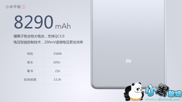 小米平板3的电池容量提升至8290mAh,支持QC3.0,续航能力全面提升。