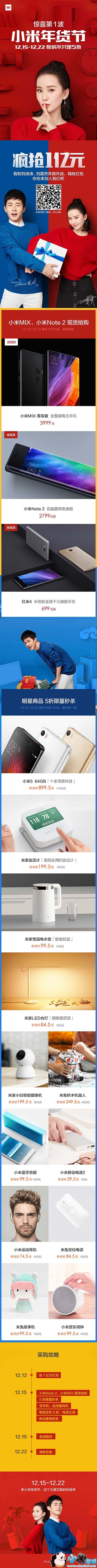 12月15日到12月22日之间,网友除了通过小米官网和小米商城APP参加活动之外,也可以前往线下小米之家参与现场的促销活动。据悉小米Note2、小米MIX等热门新机将在小米年货节12月15日到12月22日期间开启多轮现货开卖,打算换手机的米粉可要做好准备!
