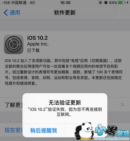 最近这两天一直收到ios10.2系统更新推送,网上都说ios10.2省电,于是第一时间想把手机升级到ios10.2,但是出现了ios10.2无法验证更新问题,即升级时提示“ios10.2验证失败 因为您不再连接到互联网”,倒腾了很久终于升级成功,下面将方法分享给大家。