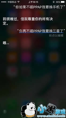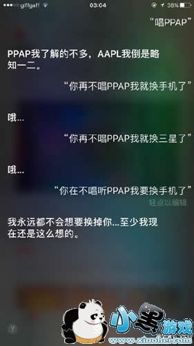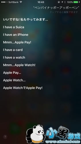 长按iPhone的Home键,启动Siri,对Siri用日语说“Pen-Pineapple-Apple-Pen”(笔-菠萝-苹果笔),Siri则模仿PPAP的节奏,加入苹果公司的产品,给出了如下爆笑反应: