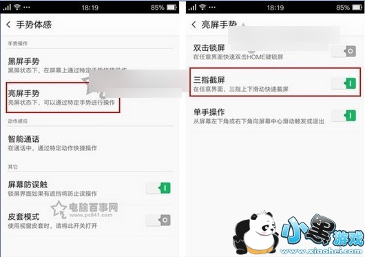 OPPO A59S系统中还加入了个性化的三指截屏功能,具体操作方法是,进入 设置 -> 手势体感 -> 亮屏手势 -> 开启“三指截屏”,如图。
