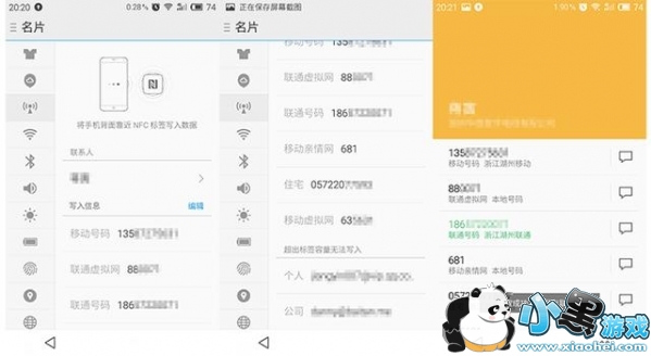 名片:在该功能处,可以将手机中的联系人信息写入到NFC标签中,使之成为电子名片,接触该NFC标签即可完成联系人的添加,并会打开联系人详情界面以供查看。(受NFC标签容量制约,无法写入过多的内容)