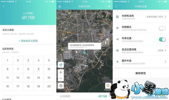 米家对讲机APP界面:分别为频段设置、定位、更多设置。