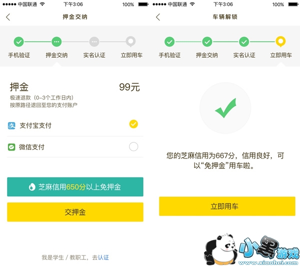 3月16日开始,上海的ofo用户通过手机App成功注册后,会自动进入“押金缴纳”的界面,下方会自动出现”芝麻信用650分免押金“和“交押金”两个选项。芝麻信用在650分及以上的用户,在支付宝开启芝麻信用的授权,成功验证用户芝麻信用分、身份认证等信息后,就自动完成了ofo免押金的信用授权,用户即可随时随地的使用ofo小黄车了。
