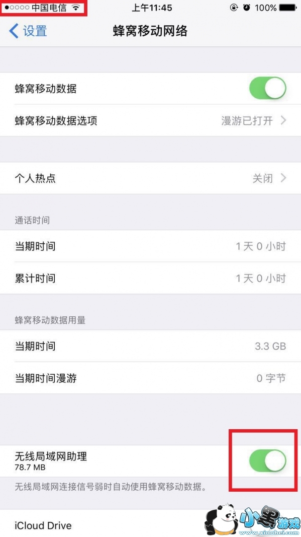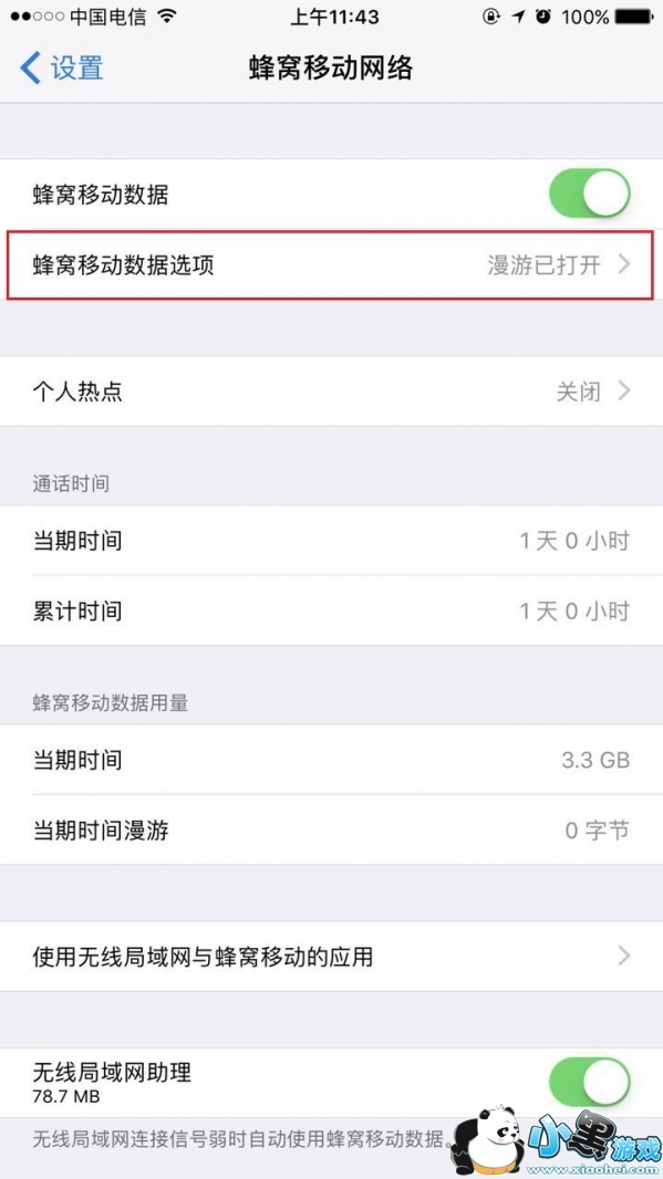 ①进入蜂窝移动网络设置,打开无线局域网助理