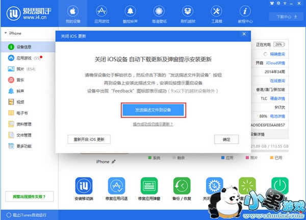 1、下载并安装最新版爱思助手PC端,用数据线将设备连接电脑;连接后在“设备信息”界面下方找到“关闭 iOS 更新”按钮并点击;
