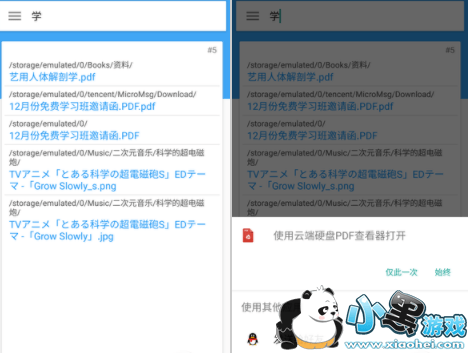 在手机中搜索文件,其实意义还是比较大的。例如你想要找某类文件,就可以输入这类文件的后缀名,直接搜索。快速搜索App支持在搜索结果列表中直接开启文件,搜出来的文件能够调用其他App开启。例如笔者想要搜一本不知道下载到了哪里的电子书,直接搜索,就可以立刻开启查看了。