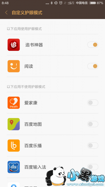 2、使用范围,全局使用就是所有系统页面都使用护眼模式,这里就不介绍了。局部就是指定某几个程序使用护眼模式,而未指定的仍使用系统模式。 自定义护眼模式程序时,系统默认阅读软件开启,而其它则关闭。 当然喽,大家也可以根据自己的爱好决定是否开启。