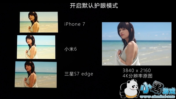 在开启护眼模式后,iPhone 7明显偏黄,而三星S7E发灰发暗,小米6的色彩还原相对更为出色,去除蓝光后,色温相较原图也有降低,观感更为自然一些。