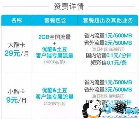 优酷大酷卡月租29元,包括2GB全国流量;而优酷小酷卡月租9元,国内接听免费。