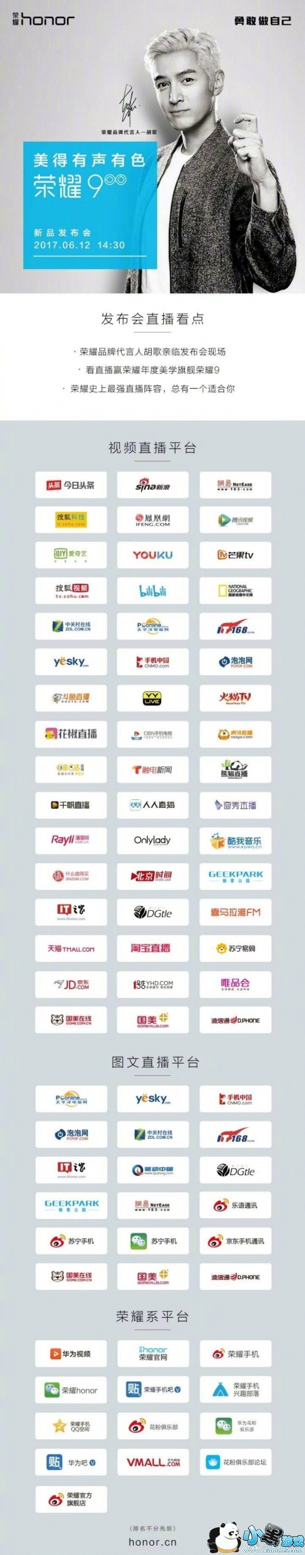 6月9日,荣耀手机在微博宣布,胡歌不仅代言,还将在6月12日亲临荣耀9发布会的现场。而且为了照顾没有在现场的粉丝们,荣耀还发布了发布会直播攻略,直播平台将涵盖3大类,除了荣耀系平台外,还有包括近50家视频直播平台,以及18家图文直播平台。