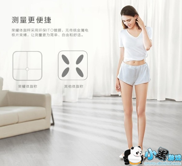 荣耀体脂秤采用了ITO导电膜,体脂秤常用的还有另一种电极片,实现原理相同,只是介质不同。电极片需要对准电极片将双脚站上去,而ITO导电膜是整个面板都能检测,随便盲站,体验更佳。
