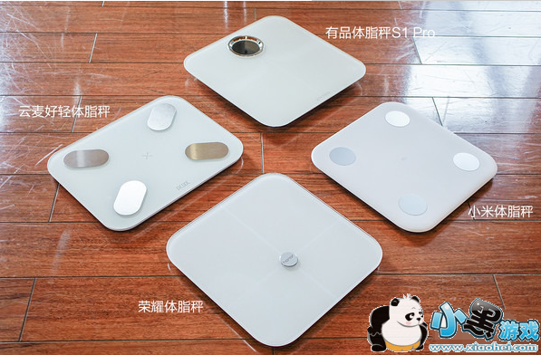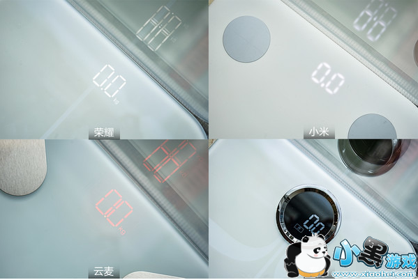 为了证明荣耀体脂秤的颜值,星仔特意向编辑部中抢来其他品牌的体脂秤,和荣耀体脂秤同价位,也是目前市场中较为热门的产品:小米体脂秤、云麦好轻体脂秤(一代)、有品体脂秤S1 Pro。可以看到有的秤表面还有4个电极贴片,看起来很丑,这就涉及到体脂秤的两种测量方式,下文将详细介绍,这里只说颜值。