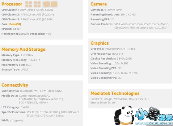 据悉,Helio X30部件号MT 6799,10nm工艺,采用两颗2.5GHz的Cortex-A73核心、四颗2.2GHz的A53核心以及4颗1.9GHz的A35核心,,GPU为专门定制的PowerVR 7XTP-MT4 GPU,主频为800MHz,支持4K屏、8GB RAM、UFS 2.1等。