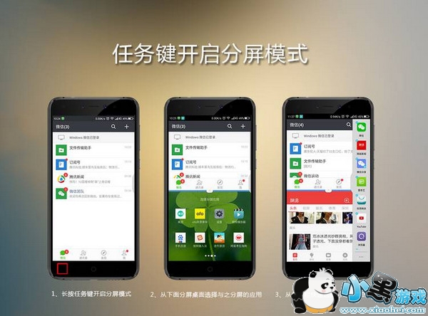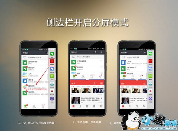 打开应用长按【任务键】即可以开启分屏,进入分屏小桌面,从分屏小桌面选择与之分屏的应用,也可以从侧边栏选择需要分屏的应用,如图: