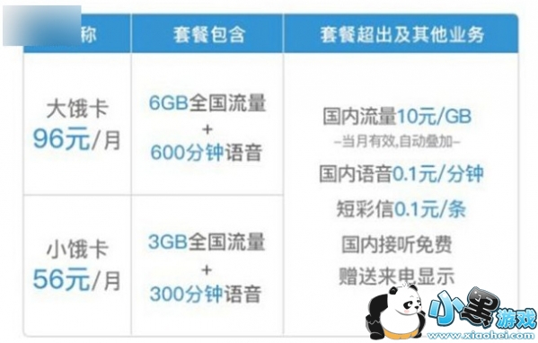 开通两张手机卡首月免费使用,首次充值50元及以上赠送50元,两张卡具体的资费上,大饿卡每月月租96元,套餐内包含6GB全国流量+600分钟语音,小饿卡月租56元每月,套餐包含3GB全国流量+300分钟语音,国内流量10元/GB,国内语音、短信0.1元/条/分钟,免费赠送来电显示。