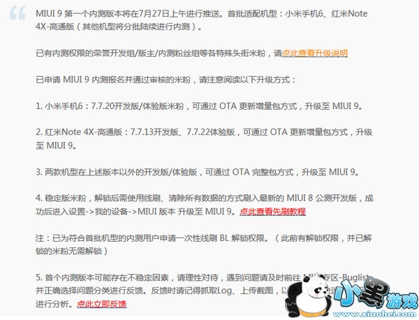 MIUI 9 第一个内测版本将在7月27日上午进行推送。首批适配机型:小米手机6、红米Note 4X-高通版(其他机型将分批陆续进行内测)。