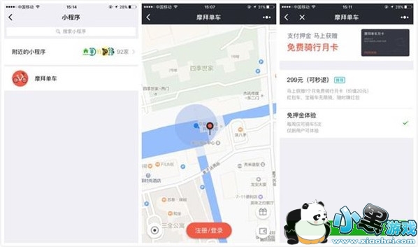 首先,用户需要在微信客户端中找到“摩拜单车”小程序,然后通过小程序注册成为新用户,再选择缴纳押金或者免押金试骑。注册成功后即可扫码骑车。本次活动仅面向新用户。