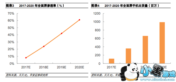 确实,在结束上半年手机厂商的双摄之争后,全面屏大概率将在未来较长一段时间内成为厂商们的必争之地。平安证券最新报告指出,2017-2020 全面屏的渗透率有望从 8%增加到 60%以上,到 2020 年全面屏手机的出货量有望达到 10 亿支,未来四年的年复合增长率预计会超过 100%。