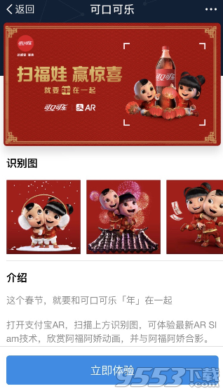用户只要打开支付宝AR扫一扫,进入“扫福娃,赢惊喜”活动,对准支付宝提供的可口可乐福娃进行识别即可进入红包页面