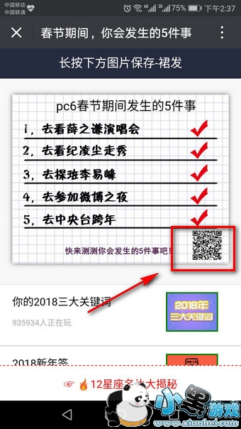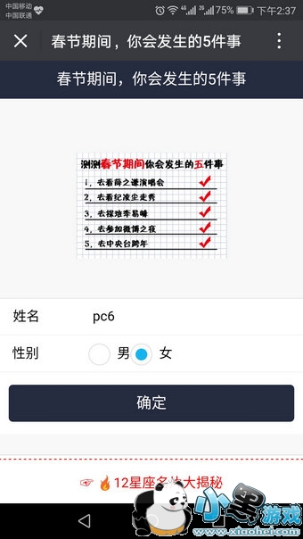 春节即将到临,各位小伙伴准备好在春节要干些什么了吗?最近微信朋友圈被春节期间发生的五件事测试各种刷屏,想知道你春节期间发生的5件事是什么吗?赶紧来测试一下吧。