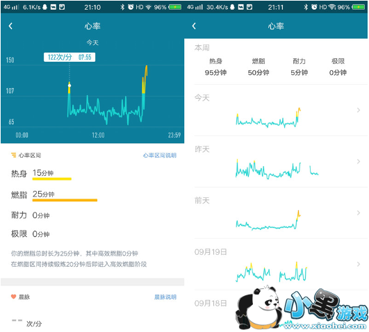 由于是不间断地监测心率,所以在APP上会有非常详细的心率记录曲线图,而且有不同色彩的曲线标识,用户可以根据当天的运动情况了解自己的心率是否存在问题。
