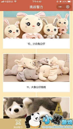 微信小程序挑战智力送娃娃而且还是免费且包邮的娃娃哦!这些免费挑战闯关成功之后送的娃娃有很多种,小白兔、倒霉熊、斑马、多来福、哈士奇、毛绒熊等等娃娃都会随机选择其中一款送到免费挑战成功的网友们手中哦!
