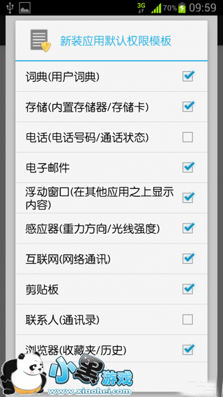 大致弄清楚XPrivacy的功能后,我们可以按手机选项键,看看更多的设置内容。这里我们可以设置下新装应用的默认权限模板,设置好后安装新的应用就可直接按模板设置权限了,不用一个个的操作了。所有内容设置完成后还可以导出全局配置,下次重新刷机后或更换手机后就可直接导入了。