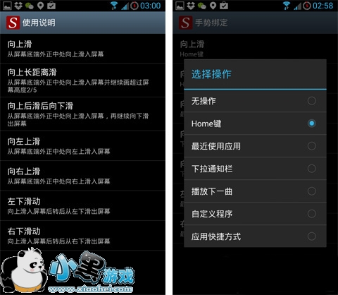 该应用提供了8种手势动作,具体的动作在“使用说明”选项中有详细描述。默认状态下,可以从屏幕底部中间向上滑来执行HOME键操作,向左上或右上滑呼 出下拉通知栏,向上后再向下呼出最近使用的应用菜单。如果有特别需要,还可以在“手势绑定”选项中对每一个手势动作的功能进行自定义设置,进而可以实现用 滑动手势快速打开自定义应用的功能。