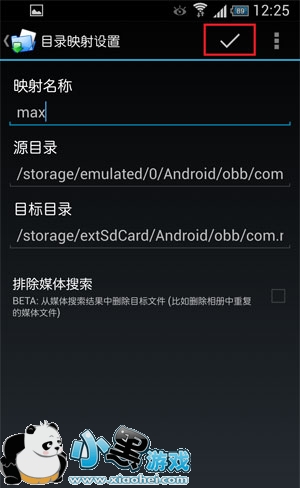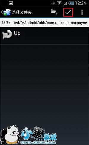 4、这时会进入手机自带存储,选择你想要挂载的目录,比如我想要挂载obb文件夹中的com.rockstar.maxpayne文件夹,那么我就进入android/obb/com.rockstar.maxpayne文件夹中,然后选择右上角的勾,如下图。