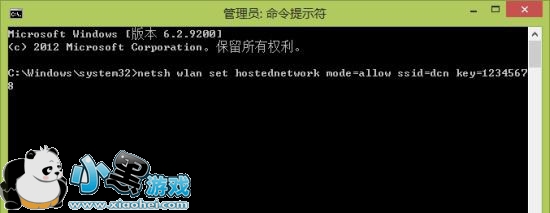 打开之后,输入命令:netsh wlan set hostednetwork mode=allow ssid=dcn key=12345678