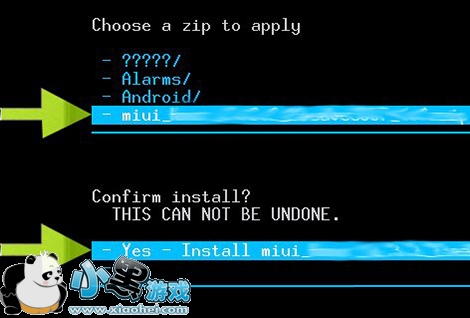 3. 进入recovery之后按音量键选择install zip from sdcard,然后再选择choose zip from sdcard,然后找到刚才放到手机sd卡里zip格式的root包 XXXX.zip,然后按音量键选中,然后按HOME键确认,接着选中 Yes-install XXXXX.zip并确认开始刷入root包。