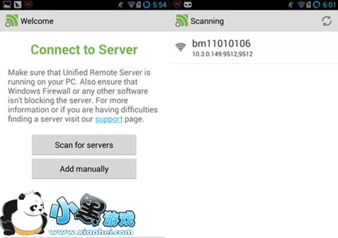 然后我们安装好远程遥控器 Unified Remote的手机APP,让手机和电脑处在同一网络环境下,这样就完全不用设置,只需要点击“Scan for Servers”就会会搜索出安装了远程遥控器 Unified Remote PC端的电脑,然后点击电脑名就可以连上了。